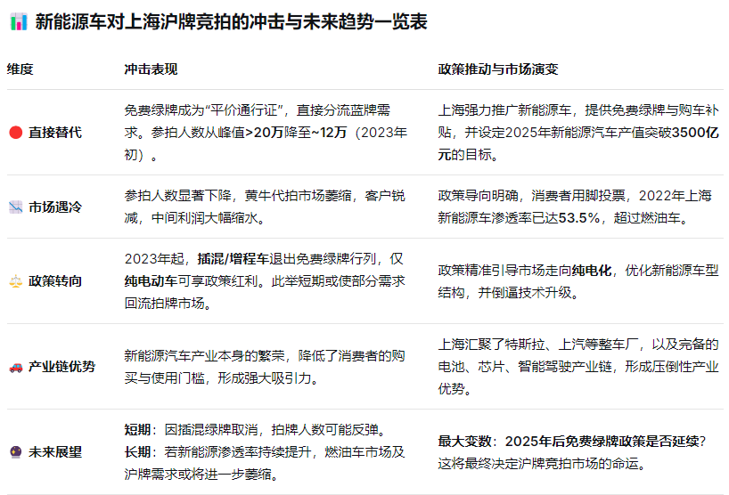下面这个表格,梳理了新能源车冲击沪牌竞拍市场的核心逻辑和未来可能的方向。