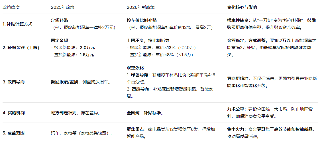 总而言之,2026年的政策是一次从“追求刺激销量”到“引导产业升级和高质量消费”的转型。它利好有技术储备、产品定位中高端的车企,以及计划购买绿色、智能产品的消费者;同时,对低端市场、单纯依赖价格竞争的企业可能形成压力。